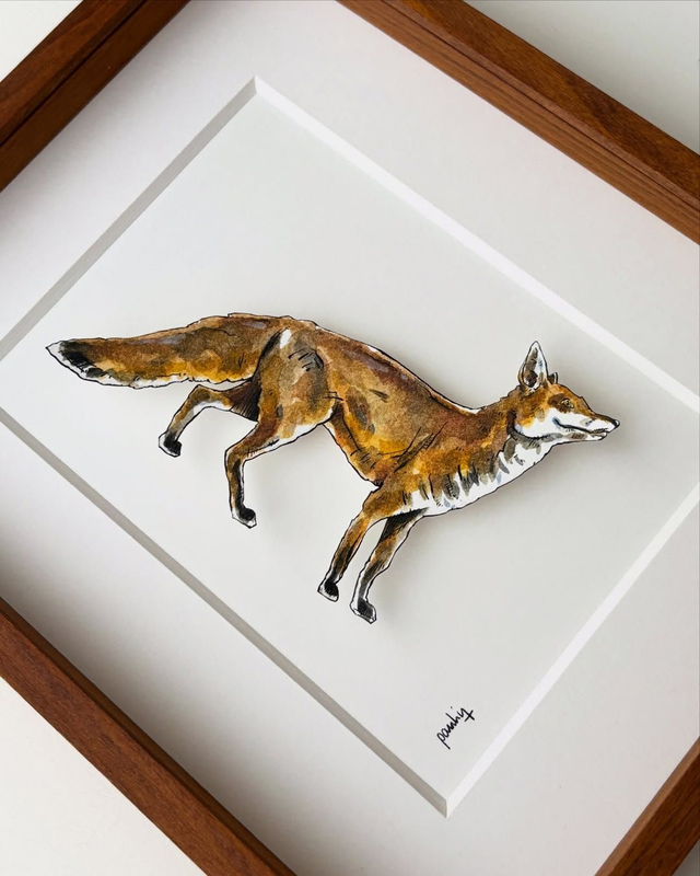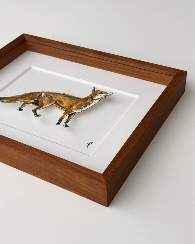Encadrement en boitage, sujet découpé et surélevé, rehausse et baguette teintées merisier doré, passe partout et verre anti-reflets