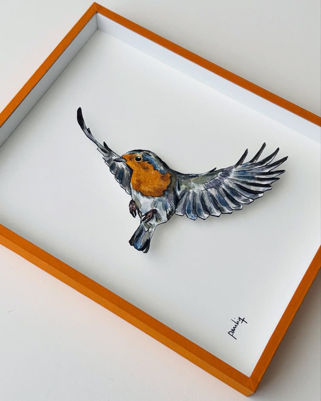 Encadrement en boitage, sujet découpé et surélevé, bordé papier, avec un verre anti-reflets